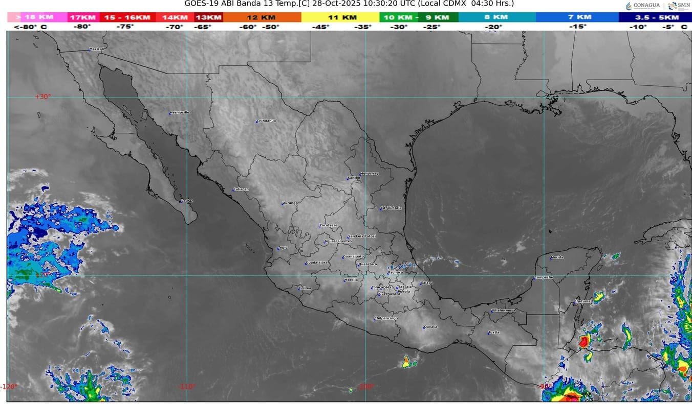 Por su parte, canales de baja presión sobre el interior del territorio nacional, en combinación con el ingreso de aire húmedo del océano Pacífico, golfo de México y mar Caribe, originarán intervalos de chubascos en estados del occidente, centro, oriente, sur y sureste de la República Mexicana, incluyendo la península de Yucatán.